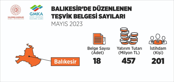 May 2023 incentive certificates issued by the Ministry of Industry and Technology were published in the Official Gazette. Accordingly, 18 incentive certificates were issued in Balıkesir. With these incentive certificates, a total of approximately 457 million fixed capital investment will be realized and 201 new jobs will be created.