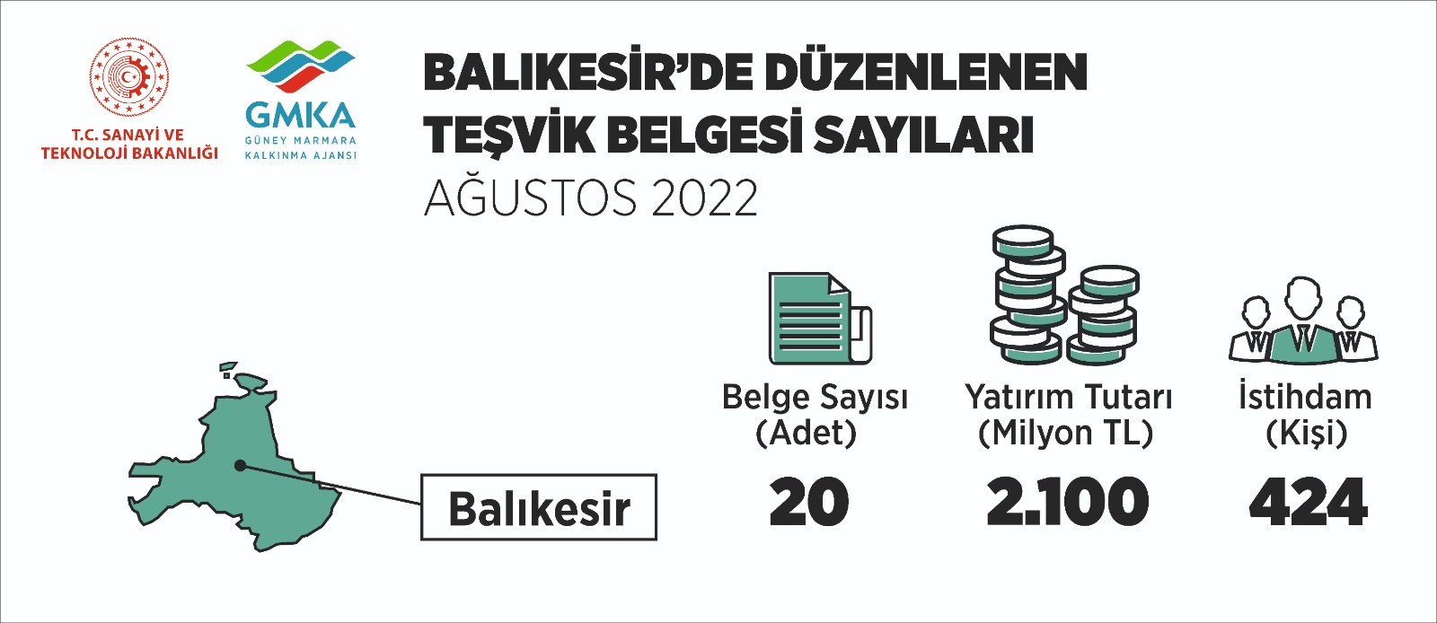 Sanayi ve Teknoloji Bakanlığı tarafından düzenlenen 2022 Ağustos ayı teşvik belgeleri Resmi Gazate'de yayımlandı.Buna göre Balıkesir'de 20 adet teşvik belgesi düzenlenmiştir. Bu teşvik belgeleriyle toplamda 2,1 milyar sabit sermaye yatırımı gerçekleştirilecek ve 424 yeni istihdam olacaktır.